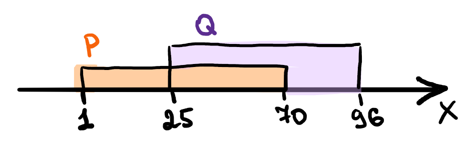 На числовой прямой даны два отрезка: P = [1, 70] и Q = [25, 96]. Укажите наибольшую возможную длину такого отрезка A, что логическое выражение