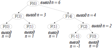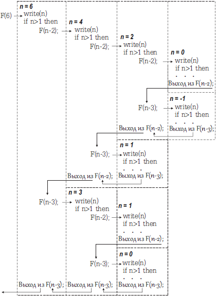 Каждый раз, возвращаясь из процедуры, переменная n принимает значение, которое было до вызова данной процедуры. Например, если процедура F(n — 2) была вызвана при n = 6, то, попадая в процедуру, переменная n примет значение 4(= 6 − 2). После выхода из этой процедуры значение переменной n вновь будет равно 6.