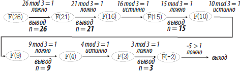 Количество чисел напечатанных на экране (26, 21, 15, 9, 3) : 5