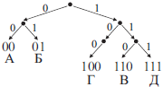 Для кодирования некоторой последовательности, состоящей из букв А, Б, В, Г и Д, используется неравномерный двоичный код, позволяющий однозначно декодировать полученную двоичную последовательность. Вот этот код: А − 00, Б − 01, В − 110, Г − 101, Д − 111.