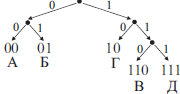 В этом случае полученный код: А — 00, Б — 01, В — 110, Г — 10, Д — 111 — будет префиксным и однозначно декодируемым.