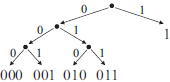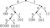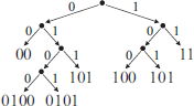 Для решения данной задачи построим дерево, у которого из корня и любой вершины выходят по две ветви. Сопоставим каждой левой ветви 0, а каждой правой — 1. Тогда, проходя от вершины к каждому из листьев (узлов, из которых не выходят ветви) и выписывая последовательность нулей и единиц, соответствующих обходу дерева, получим набор кодовых слов, образующих префиксный код (код, в котором ни одно кодовое слово не является началом другого). Префиксный код является однозначно декодируемым. На рисунке представлено дерево, соответствующее заданному коду.