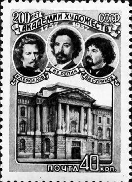 Какие из представленных картин принадлежат художникам, входившим в то же художественное объединение, что и художник, изображённый на марке? В ответе запишите две цифры, которыми обозначены эти картины.