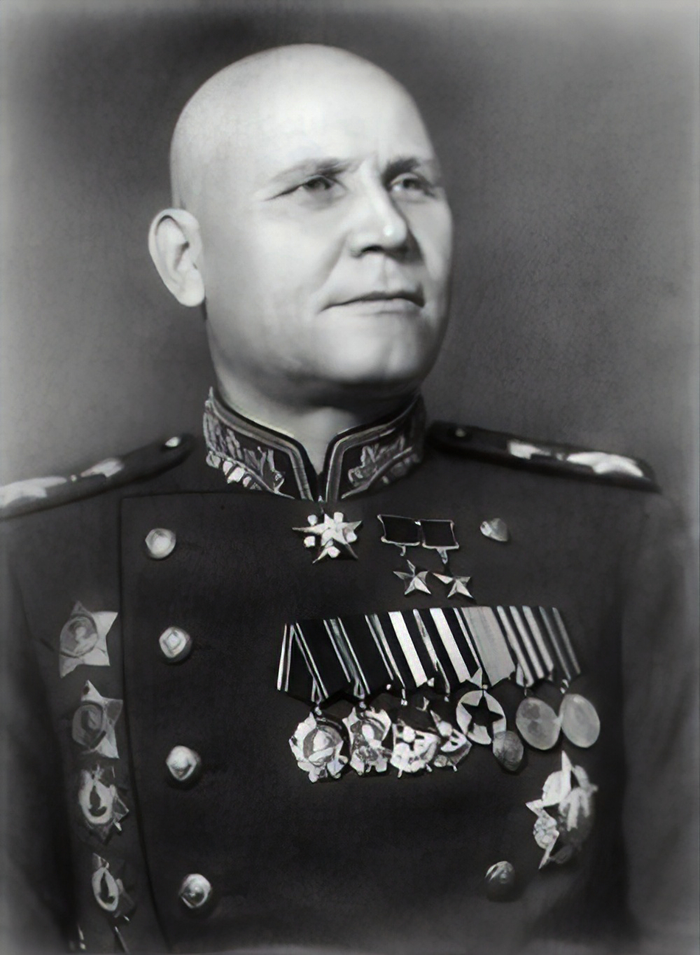 Какие из представленных фотографий показывают современников и соратников военачальника, изображённого на марке? В ответе запишите две цифры, которыми обозначены эти фотографии.