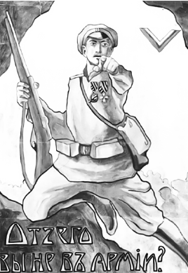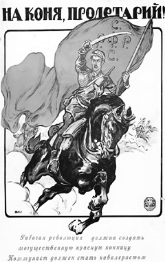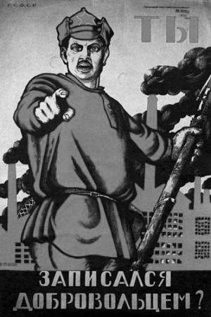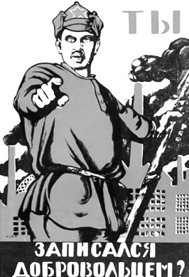 Какие из представленных плакатов созданы той стороной Гражданской войны, к которой принадлежал деятель, изображённый на марке? В ответе запишите две цифры, которыми обозначены эти плакаты.