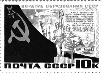 Какие из представленных марок посвящены юбилеям событий, произошедших в то же десятилетие, что и событие, изображённое на плакате? В ответе запишите две цифры, которыми обозначены эти марки.