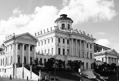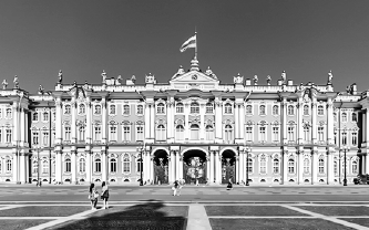 Какие из представленных фотографий связаны с городом, в котором находится данное здание? В ответе запишите две цифры, под которыми указаны эти фотографии.