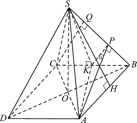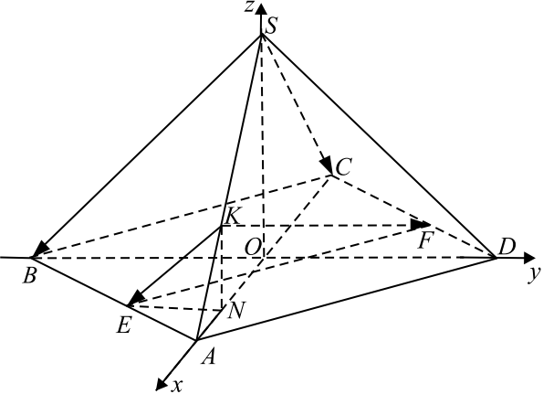 1. Найдём координаты точек $S, B, C , K , E, F$. В прямоугольном треугольнике $SOA$ по теореме Пифагора $OA^2 = SA^2 — SO^2, OA = √{12^2 — 4^2} = 8√2. OC = OB = OD = OA = 8√2$, тогда сторона квадрата $AB = {OA}/{sin 45°} = {8√2}/{{1}/{√2}} = 16, AE = AB — BE = 16 — 12 = 4$.