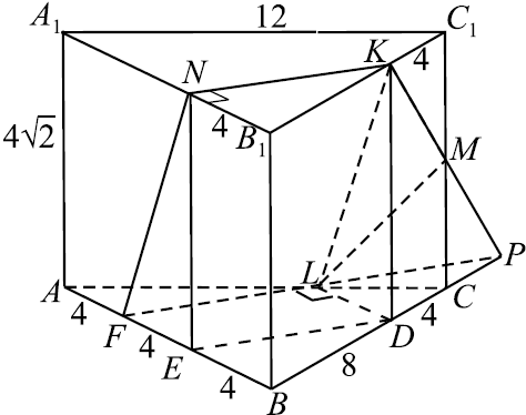 В правильной треугольной призме $ABCA_1 B_1 C_1$ сторона основания равна $12$, а боковое ребро равно $4√ {2}$. На рёбрах $AB$, $A_1 B_1$ и $B_1 C_1$ отмечены точки $F$, $N$ и $K$ соответственно, причём $AF=B_1 N=C_1 K =4$.