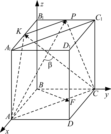 2. Выберем прямоугольную систему координат, как показано на рисунке. Найдём координаты нужных точек: $B(0; 0; 0), F (8√2; 8√2; 4), A(8√2; 0; 0), C (0; 8√2; 0), K (4√2; 0; 16), P (0; 4√2; 16)$.