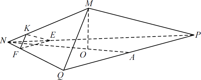В плоскости $MPQ$ возьмём прямые $QP$ и $MQ$, а в плоскости $EFK$ — прямые $FE$ и $KF$. Пусть $O$ — центр основания.
