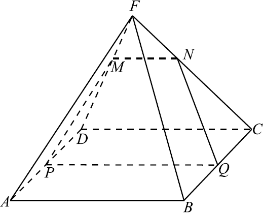 На боковом ребре $FD$ правильной четырёхугольной пирамиды ${FABCD}$ отмечена точка $M$ так, что $FM:FD=2:5$. Точки $P$ и $Q$ — середины рёбер $AD$ и $BC$ соответственно.