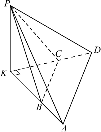 Проведём $KN ‖ SO, SO ⊥ (ABC)$, тогда $KN ⊥ (ABC)$ и $KN ⊥ OA, △SAO ∼ △KAN$ по первому признаку подобия $(∠SOA = ∠KNA = 90°, ∠A$ — общий) ${AS}/{AK} = {SO}/{KN}, {12}/{3} = {4}/{KN}, KN = 1$.