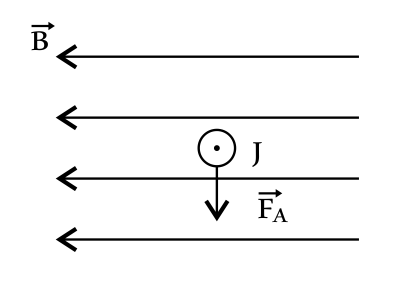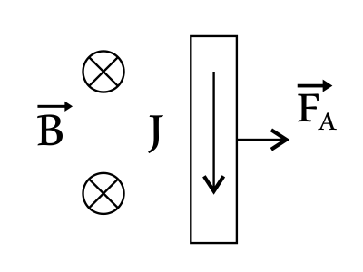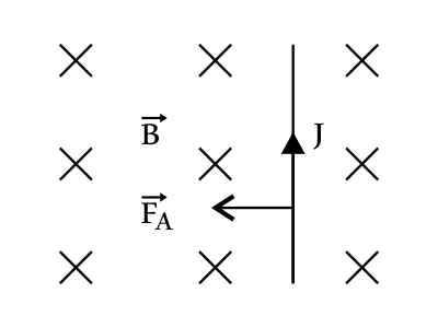 Согласно правилу левой руки, если левую руку расположить так, чтобы линии индукции магнитного поля $В↖{→}$ входили в ладонь, четыре пальца были направлены по току $J$, то отогнутый на 90° большой палец левой руки укажет направление силы Ампера (от наблюдателя).