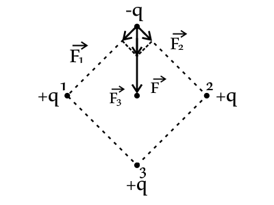 Согласно принципа суперпозиции сил, равнодействующая сила Кулона будет напрвлена вниз. Положительный и отрицательный заряды притягиваются друг к другу: $F↖{→}={F_1}↖{→}+{F_2}↖{→}+{F_3}↖{→}$.