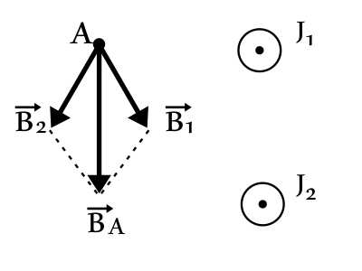 По правилу суперпозиции, вектор магнитной индукции в точке $A$ ${B_A}↖{→}$ будет направлен вниз: ${B_A}↖{→}={B_1}↖{→}+{B_2}↖{→}$, где ${B_1}↖{→}$ — индукция магнитного поля в точке $A$ от проводника с током $J_1$; ${B_2}↖{→}$ — индукция магнитного поля в точке $A$ от проводника с током $J_2$.