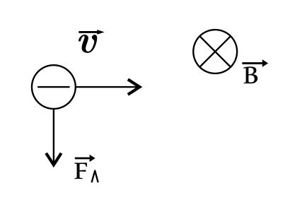 Так как это электрон, воспользуемся правилом левой руки и определим силу Лоренца, действующую вверх. Важно помнить, что так как заряд электрона отрицательный, 4 пальца левой руки мы направляем против его скорости.