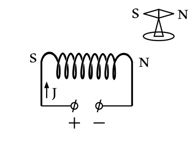 Определим полюсы соленоида: ближайший полюс к магнитной стрелке — северный N, значит, магнитная стрелка повернется к соленоиду южным S полюсом. Полюсы соленоида определяем по правилу Буравчика: если рукоятку буравчика вращать по направлению силы тока $J$ в витках соленоида, то острие буравчика будет показывать направление вектора индукции магнитного поля.