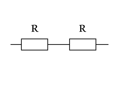Найдем общее сопротивление двух последовательно соединенных резистора: $R_{общ.посл.}=R+R=2R$.