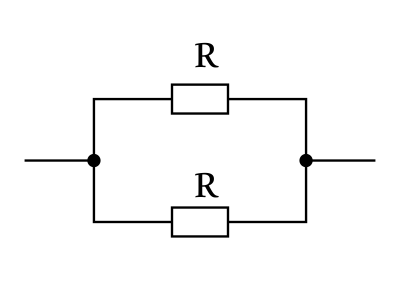 Найдем общее сопротивление двух параллельно соединенных резистора: ${1}/{R_{общ.пар.}}={1}/{R}+{1}/{R}={2}/{R}⇒R_{общ.пар.}={R}/{2}$