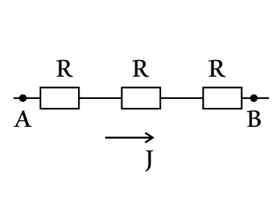 По закону Ома имеем: $J={U}/{R_{общ.}}⇒R_{общ.}={U}/{J}⇒3R={U}/{J}⇒R={U}/{3J}$(2)