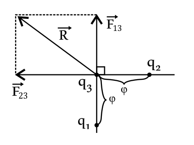Из рисунка видно, что равнодействующая $R↖{→}$ двух сил ${F_{13}}↖{→}$ и ${F_{23}}↖{→}$ по теореме Пифагора равна: $R=√{F_{13}^2+F_{23}^2}=√{(4)^2+(12)^2}=√{16+144}=√{160}H=12.649H≈13H$