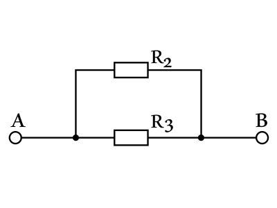 Из рисунка видно, что резистор $R_1$ закорочен, ток по нему не потечет (т.к. ток всегда течет по пути наименьшего сопротивления), поэтому $R_1$ можно исключить из схемы: . Сопротивления $R_2$ и $R_3$ соединены параллельно, поэтому: ${1}/{R_{AB}}={1}/{R_1}+{1}/{R_2}={1}/{3}+{1}/{3}={2}/{3}$ или $R_{AB}={3Ом}/{2}=1.5Ом$