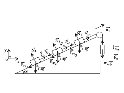 1 груз: $Ох_1$: $ma=T_{12}-mgsinα-F_{тр_1}$, где $F_{тр_1}=μN_1$; $Oy_1$: $O=N_1-mgcosα$, откуда $N_1=mgcosα; ma=T_{12}-mgsinα-μmgcosα$(2).