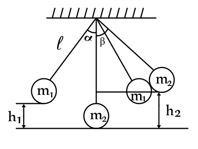 Запишем закон сохранения энергии: $W_{п_1}=W_{к_1}$ или $m_1gh_1={m_1υ_1^2}/{2}$(2), где $h_1=l(1-cosα)$, где $l$ — длина нити. Тогда скорость первого шара перед ударом: $υ_1=√{2gl(1-cosα)}$(3). Запишем закон сохранения импульса: импульс системы остается постоянным при любых взаимодействиях внутри системы: $m_1υ_1↖{→}=(m_1+m_2)·U↖{→}$(4). В проекции на ось $X$: $m_1υ_1=(m_1+m_2)·U$(5). Тогда скорость шаров после соударения: $U={m_1υ_1}/{(m_1+m_2)}$(6). Запишем закон сохранения энергии: $W’_{к_1}=W’_{п_1}$ или ${m_1U^2}/{2}=m_1gh_2$, где $h_2=l(1-cosβ)$(7). Тогда высота $h_2$, на которую поднимутся шары после удара: $h_2={U^2}/{2g}={1}/{2g}·{m_1^2}/{(m_1+m_2)^2}·υ_1^2={1}/{2g}·{m_1^2·2gh_1}/{(m_1+m_2)^2}$ или $l-lcosβ={m_1^2·(l-l·cosα)}/{(m_1+m_2)^2}⇒l(1-cosβ)={0.09·l(1-cosα)}/{0.25}⇒0.25-0.25cosβ=0.09-0.09cosα⇒0.25-0.25cosβ=0.09-0.09cos60°⇒0.25-0.25cosβ=0.09-0.09·0.5$