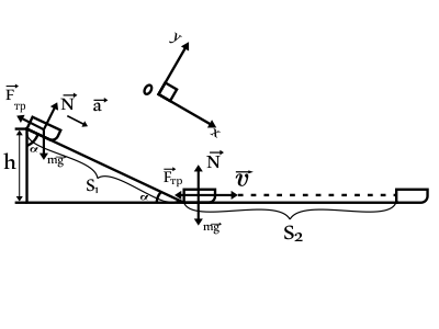 2 закон Ньютона при движении по склону: $ma↖{→}_1=mg↖{→}+F_{тр}↖{→}_1+N↖{→}_1$